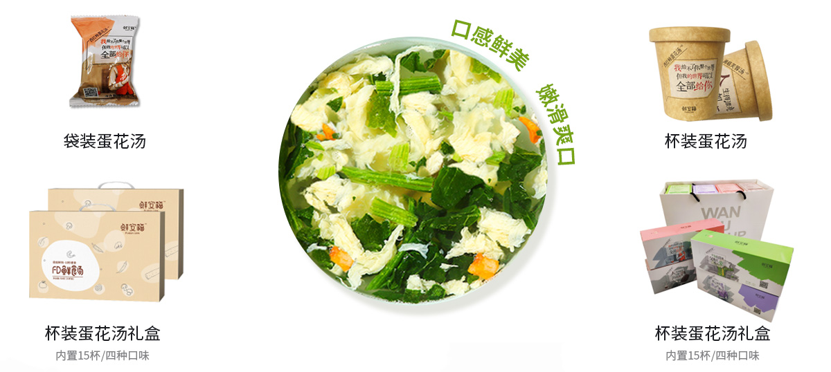 【产 品 名】 FD--蛋花汤 【规 格】 8g 【生产日期】 见包装 【保质日期】 12个月 【配 料 表】 鸡蛋、紫菜、西红柿、小白菜...... 【储藏方式】 常温、通风、阴凉干燥处 【生 产 商】 青岛太阳集团tyc4633集团股份有限公司